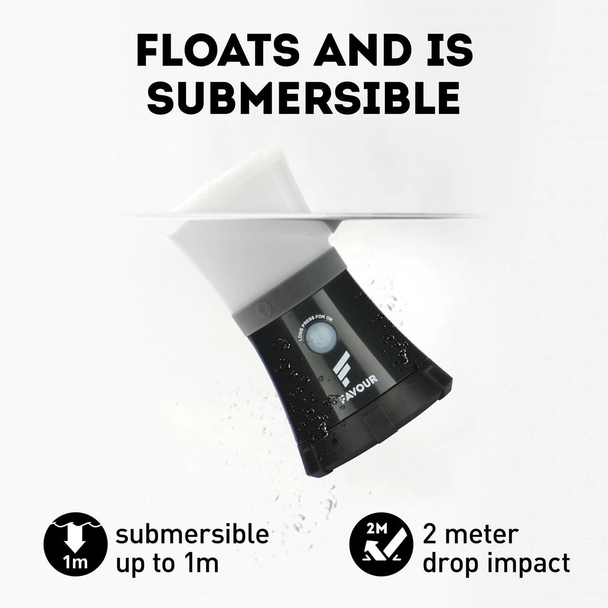 Komt de lamp in een riviertje of de visvijver terecht? Geen enkel probleem. Hij blijft drijven en is tot 1 meter onder te dompelen onder water.
