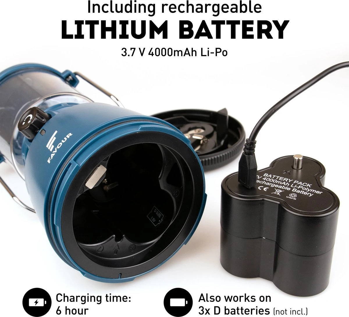 Favour L0818 Retro Camping Lamp Oplaadbaar LED, 320 Lumen, IP64 Waterdicht, Draagbare Kampeerlamp, Tentlamp, Acculamp, Traploos Dimbare Lamp Incl. Kaarslicht-modus, Blauw