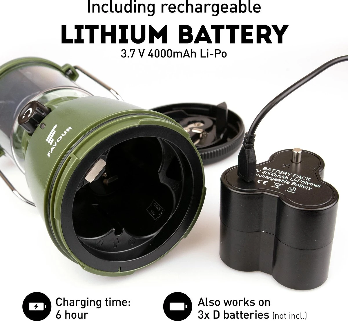 Favour L0818 Retro Camping Lamp Oplaadbaar LED, 320 Lumen, IP64 Waterdicht, Draagbare Kampeerlamp, Tentlamp, Acculamp, Traploos Dimbare Lamp Incl. Kaarslicht-modus, Groen