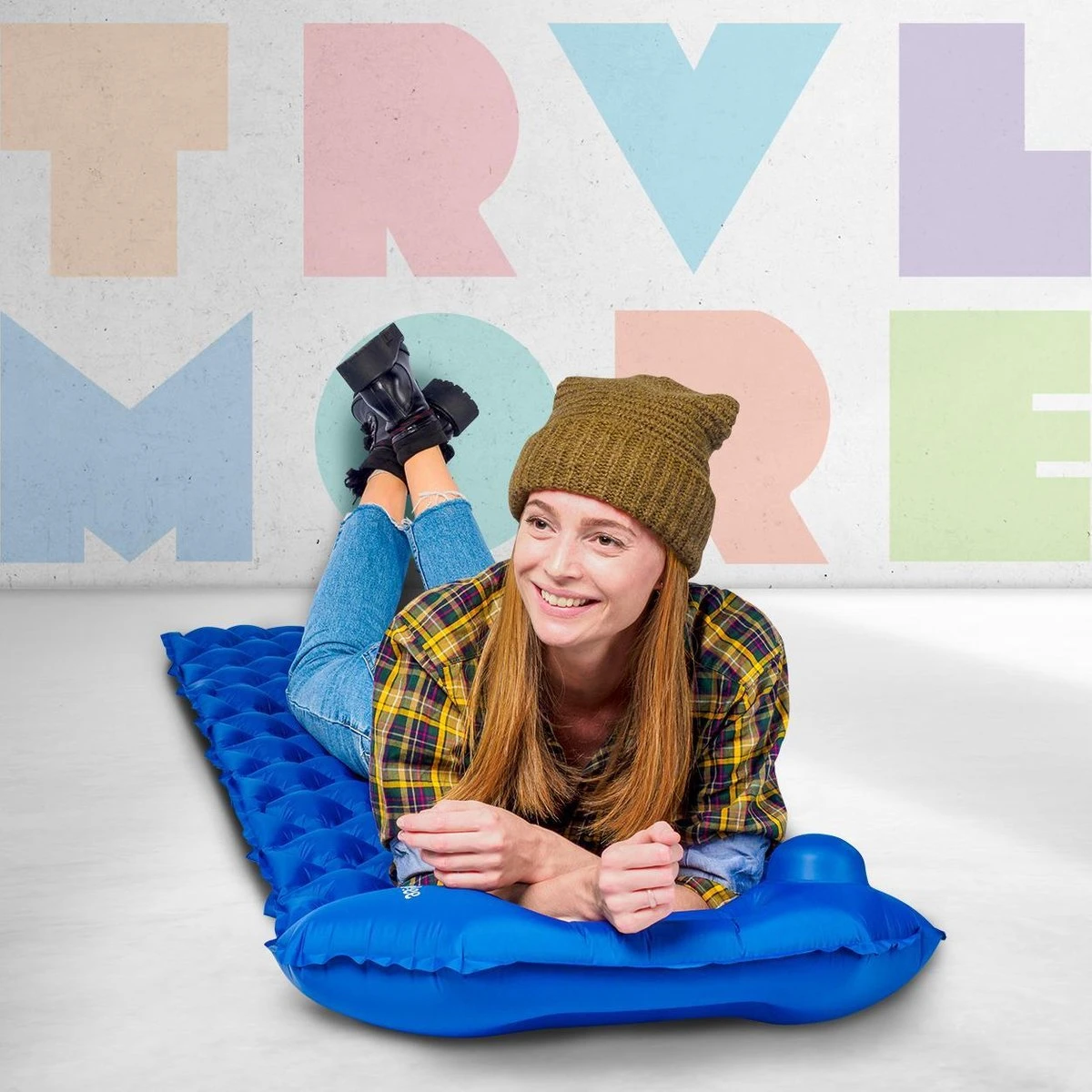 Een comfortabel en compact slaapmatje die makkelijk in je rugzak past? Blaas de TRVLMORE slaapmat in 2 minuten op met de geïntegreerde voetpomp en kruip in bed! Heerlijk comfortabel en gemaakt van zacht en stevig 40D nylon. De slaapmat is 6 cm dik en is afgewerkt met een vochtbestendige TPU coating. Het hoofdkussen heeft een ideale hoogte voor je nek. Het honingraat ontwerp houdt je lichaamswarmte goed vast. Zo kun je er de volgende dag weer helemaal tegenaan!